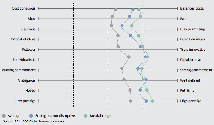 What are the characteristics behind these – high flying – innovators? The BCG report provides insights across 10 dimensions, profiling the participants in 3 levels according to their “innovation strength”: