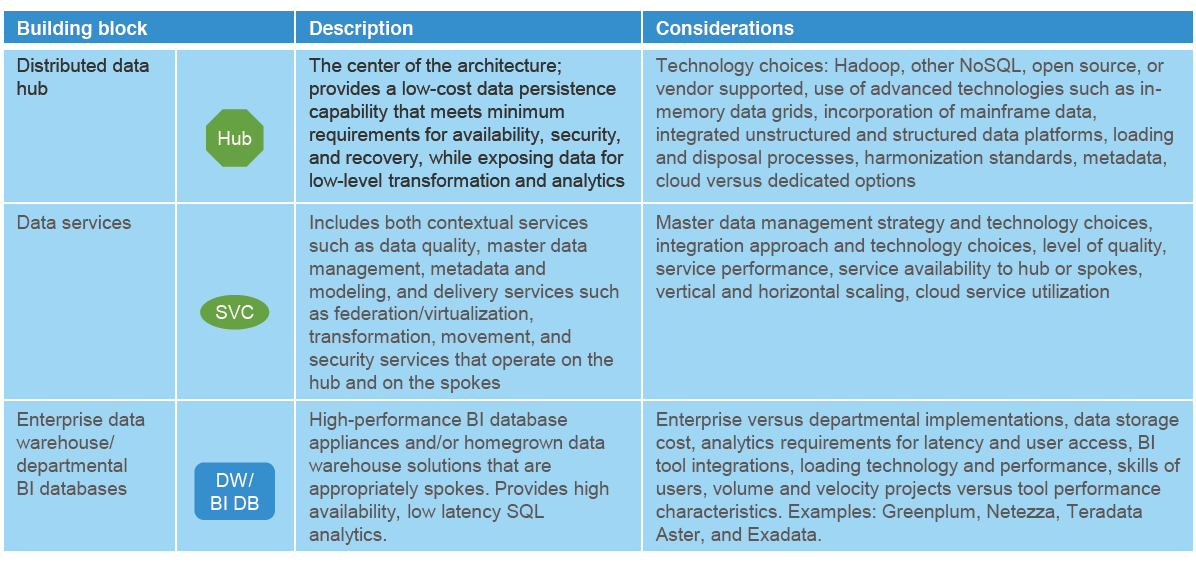 Each pattern is described through a diagram (e.g. the Data Refinery plus DW / BI DBMS)